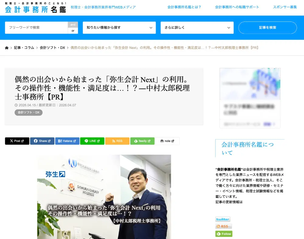 メディア実績 Webメディア「会計事務所名鑑」 2026年4月15日 2026年4月15日 haratakazuhiko 税理士・会計事務所業界専門WEBメディアである「会計事務所名鑑」に弊社事務所が掲載されました。 外部サイト偶然の出会いから始まった「弥生会計 Next」の利用。その操作性・機能性・満足度は…!?―中村太郎税理士事務所